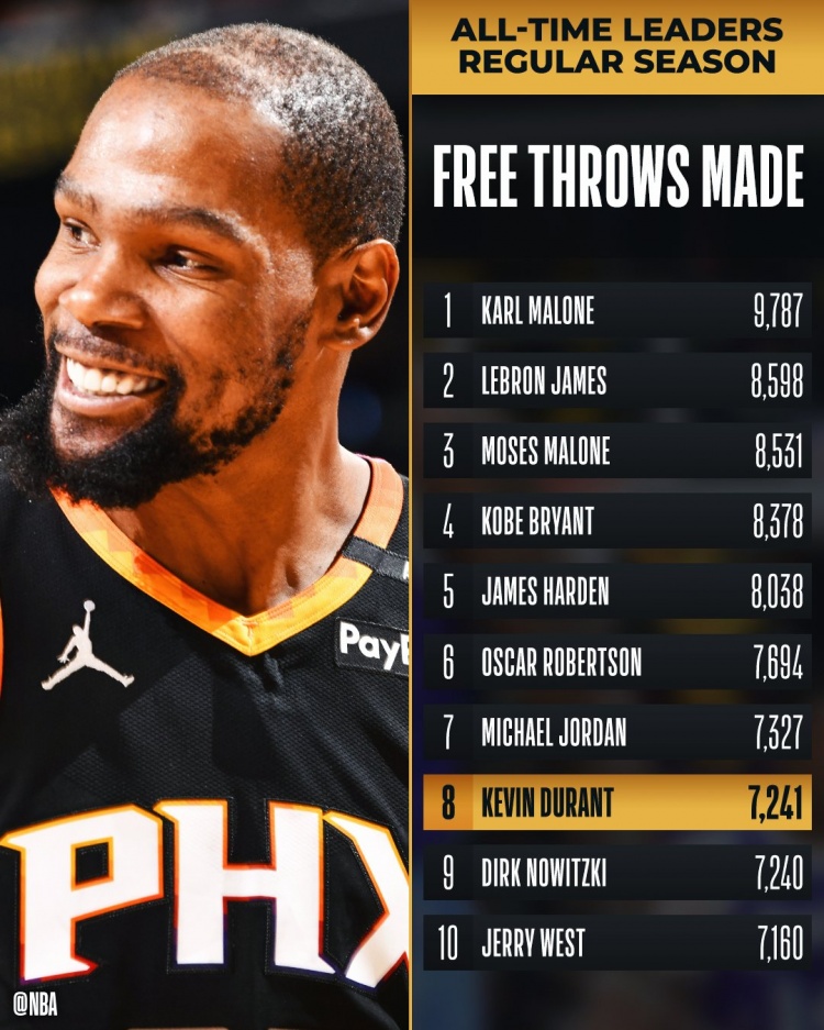 2025-03-10 07:39:54?KD常規(guī)賽罰球命中數(shù)達到7241次 超越諾維茨基升至歷史第8!