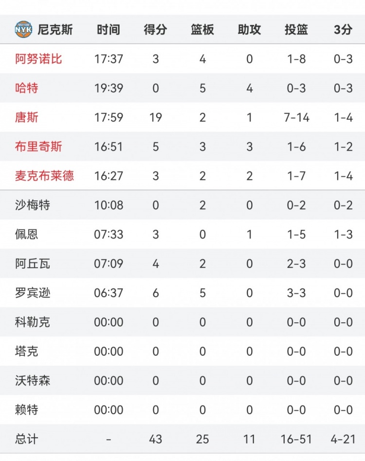 2025-03-20 11:29:27瞎打!唐斯半場19分 其余尼克斯首發24中3共得11分