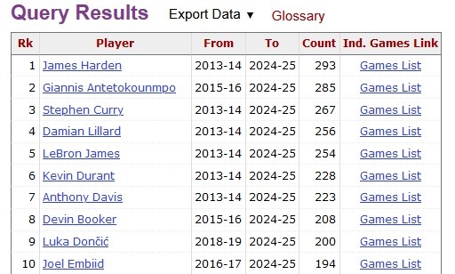 2025-03-22 21:00:242014年至今聯盟球員30+場次數榜:哈登294第一 字母第二 庫里第三