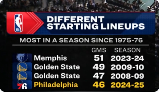 2025-03-22 21:36:25傷兵滿營!76人本賽季70場比賽排出46套首發 49年來歷史第四多