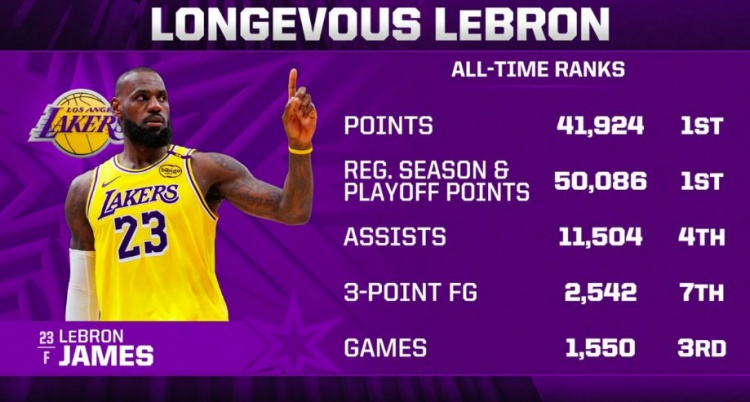 老詹41924分歷史第一;常規賽+季后賽50086分第一;總助攻11504第4;總三分命中2542個歷史第7;出戰1550場歷史第3