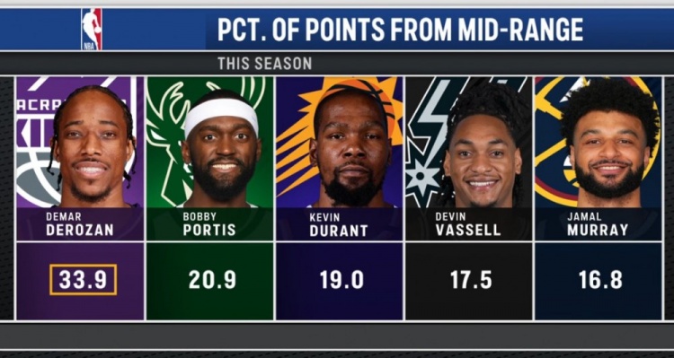 2025-03-23 12:18:50經(jīng)典永不過時!本賽季中距離得分占比德羅贊33.9%第一&杜蘭特第三