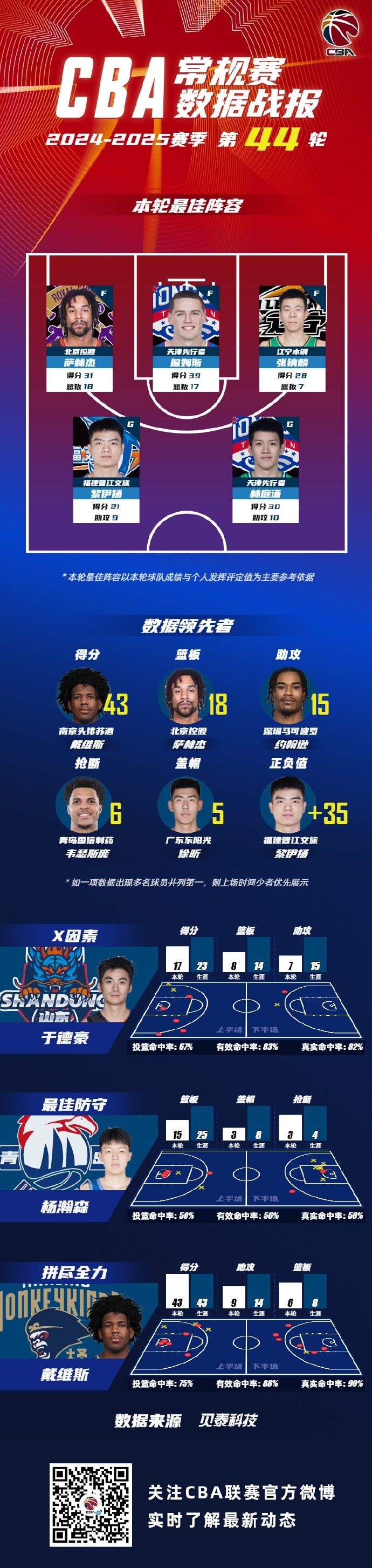 數據領先者方面:南京同曦籃球俱樂部球員戴維斯以單場43分的數據領銜得分榜;