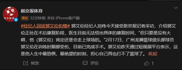 2025-02-19 20:24:21廣州領隊:郭艾倫剛受傷眼球充血短時間失明 術后視力在逐漸恢復