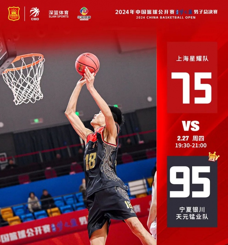 上半場,兩隊打得相對膠著,比分緊咬。首節戰至19-18,上海星耀領先一分。次節28平后,上海星耀24號劉暢連續命中三分,21號高文浩兩分再打中,12號周顧軒1投1罰得3分,上海星耀打出一波得分小高潮。隨后寧夏天元錳業奮起直追,上半場結束,上海星耀47-42領先寧夏天元錳業。下半場,8號于思洋、29號于哲扛起寧夏天元錳業進攻大旗,在第三節實現反超。末節,上海星耀手感欠佳,寧夏天元錳業在外線多次投中,繼續擴大領先優勢,最終上海星耀75-95不敵寧夏天元錳業。