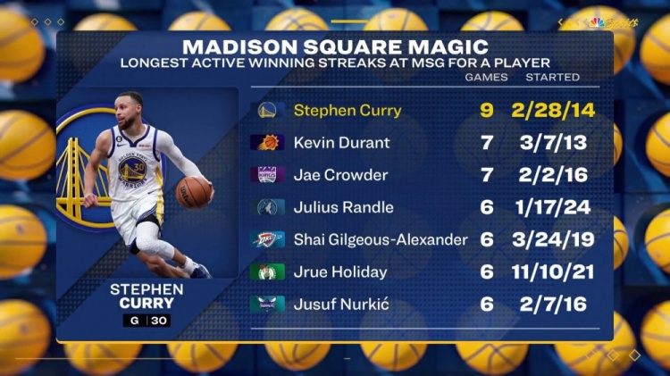 2025-03-05 08:37:17現役球員在尼克斯主場連勝榜:庫里9連勝第1 杜蘭特7場并列第2
