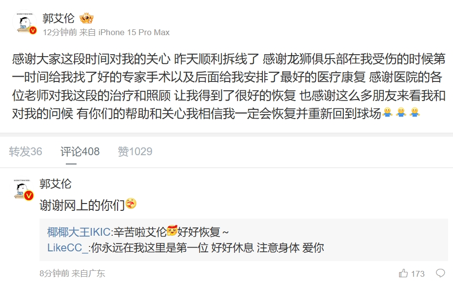2025-03-05 15:51:29郭艾倫更博報平安:順利拆線了 我一定會恢復并回到球場!