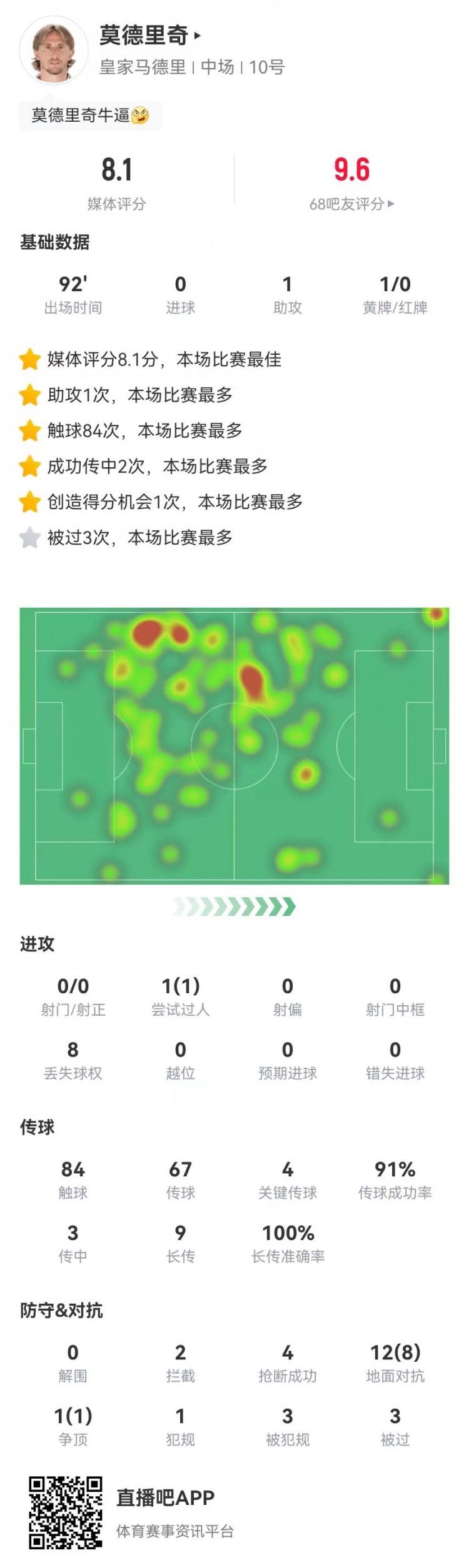 2025-03-10 03:17:05莫德里奇本場1助攻4關鍵傳球 10長傳9成功 13對抗9成功 8.1分最高