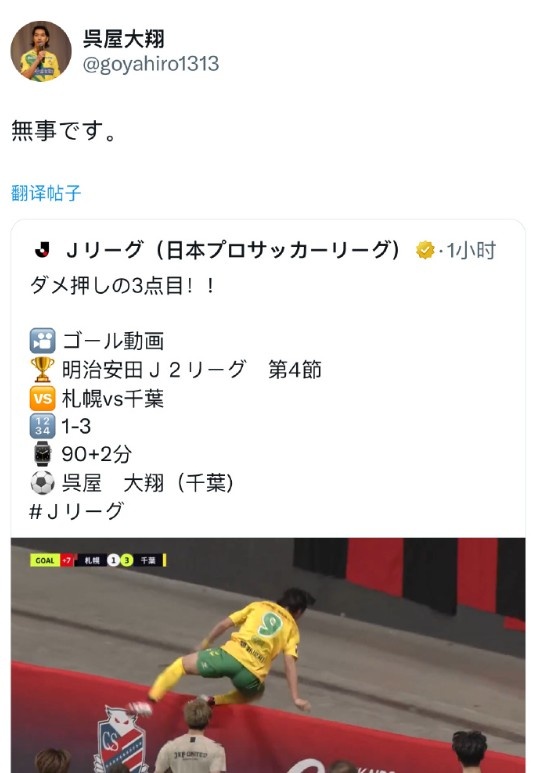 好在經過一番檢查,吳屋大翔并無大礙,并回到球場繼續比賽,比賽結束后,吳屋大翔也轉發了自己“出糗”視頻,并寫道“平安無事。”,再次讓球迷們安心。