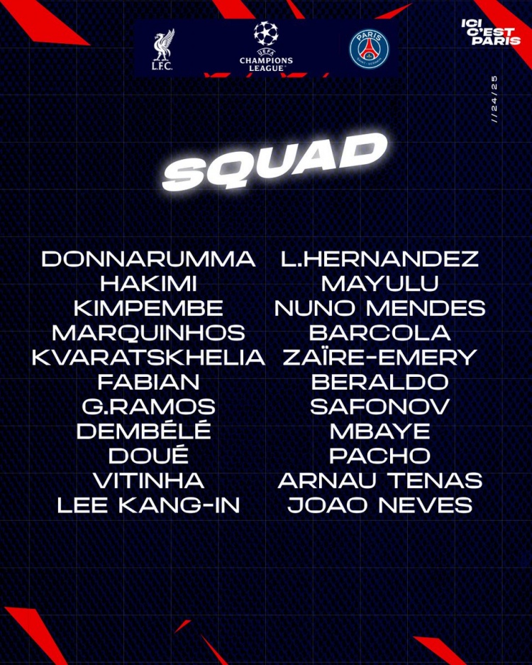 2025-03-10 19:53:51巴黎歐冠客戰利物浦名單:登貝萊、克瓦拉茨赫利亞、巴爾科拉在列