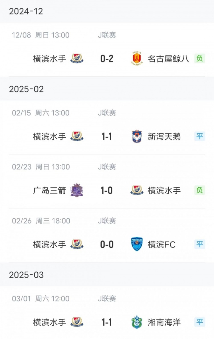 數(shù)據(jù)顯示,本賽季J聯(lián)賽戰(zhàn)罷5輪,橫濱水手還未嘗勝績,4輪聯(lián)賽(橫濱少賽一場)僅3平1負(fù)打進2球,目前積3分排在J聯(lián)賽積分榜第18位。而算上上賽季的話,橫濱水手在J聯(lián)賽已經(jīng)連續(xù)5場不勝(3平2負(fù)打進2球丟掉5球)。