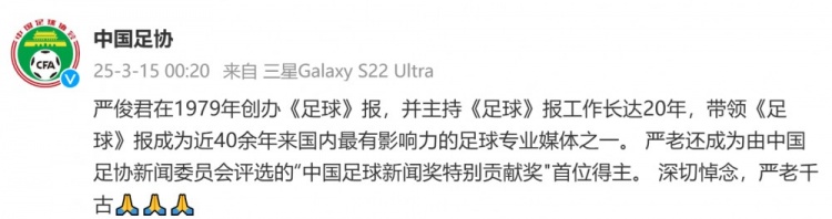 2025-03-15 00:41:45中國足協(xié)發(fā)文悼念《足球》報創(chuàng)刊人嚴俊君:深切悼念,嚴老千古