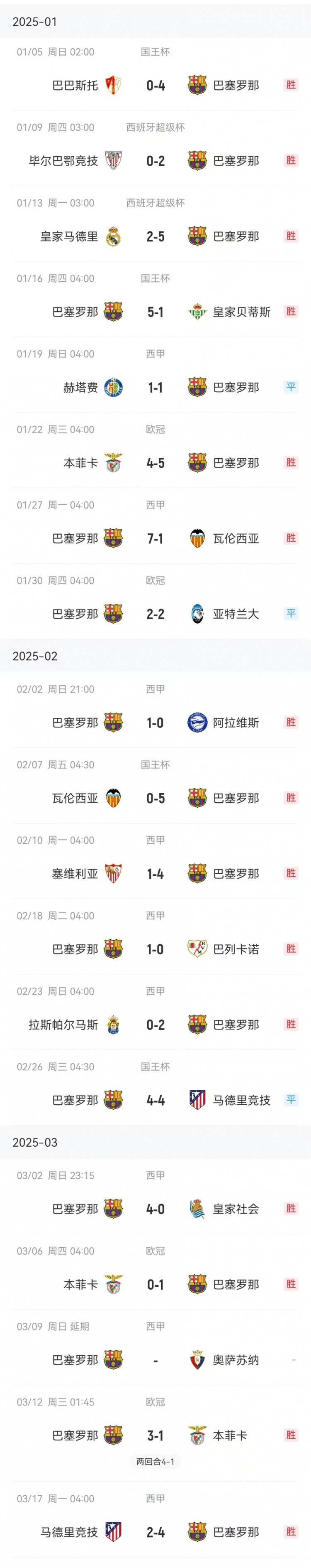 2025-03-17 11:23:28今年還沒(méi)輸過(guò)!巴薩各項(xiàng)賽事近18場(chǎng)15勝3平,打進(jìn)58球丟19球