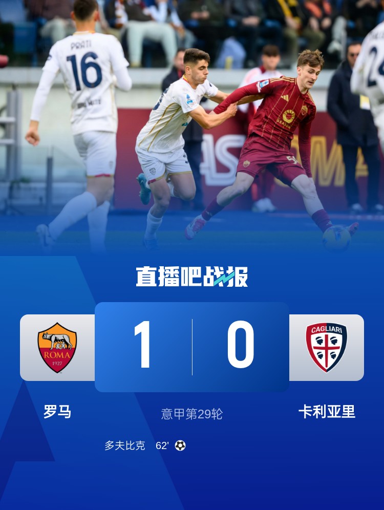 意甲六連勝!羅馬1-0卡利亞里升至第七 多夫比克制勝迪巴拉傷退