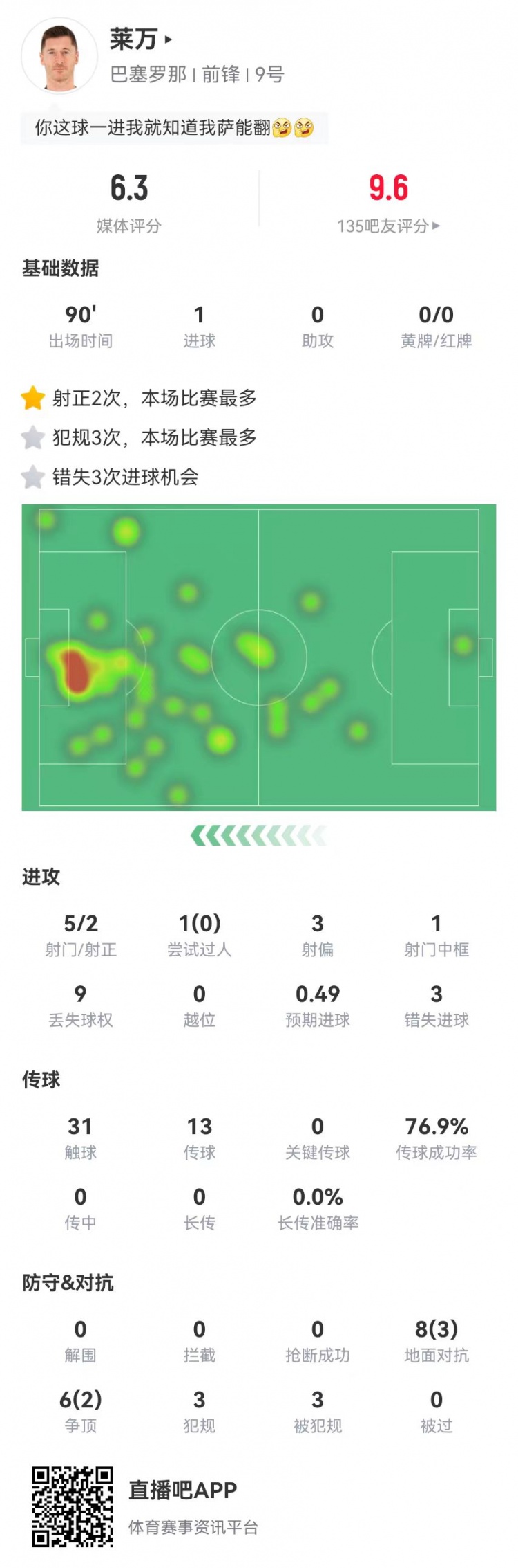 2025-03-17 11:23:32萊萬本場5射2正 1球3失良機 14對抗5成功 3犯規3造犯規 僅獲6.3分
