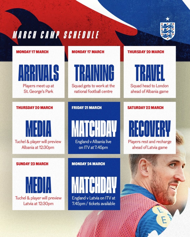 2025-03-17 20:13:35英格蘭本期集訓日程:3月17日集合,將對陣阿爾巴尼亞、拉脫維亞