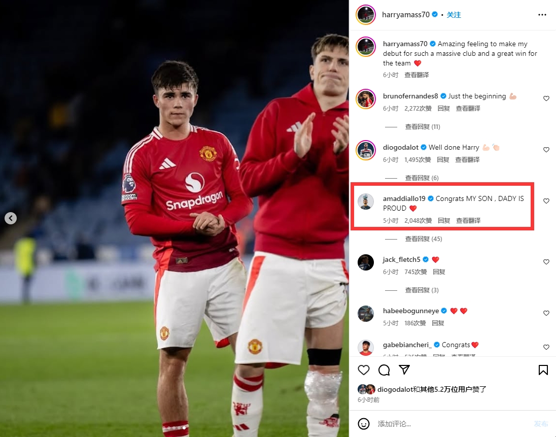 2025-03-17 20:25:1218歲阿瑪斯曼聯首秀,22歲阿瑪德:祝賀我的兒子,爸爸很自豪??