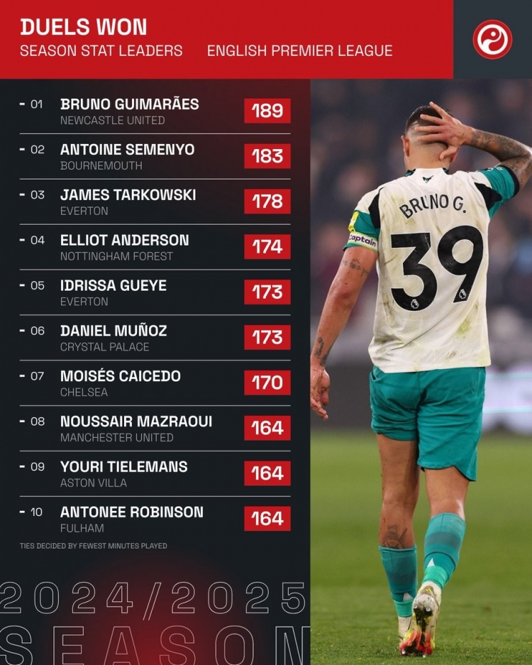 2025-03-18 07:03:32本賽季英超成功對(duì)抗榜:吉馬良斯居首,凱塞多、馬茲拉維在列