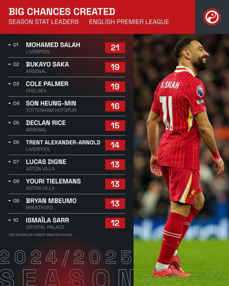 2025-03-18 07:04:11本賽季英超創造重大機會榜:薩拉赫21次居首,薩卡&帕爾默19次