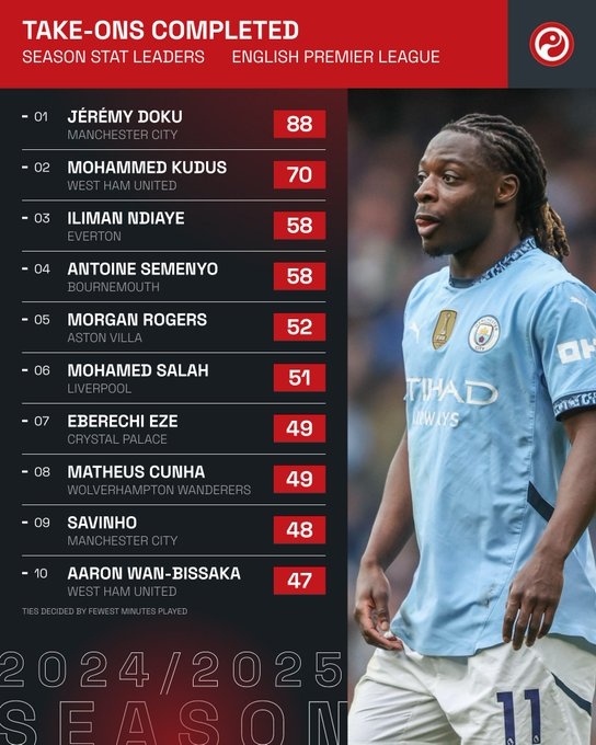 2025-03-18 07:04:13本賽季英超成功過人榜:多庫88次獨自領跑,薩拉赫、薩維尼奧在列