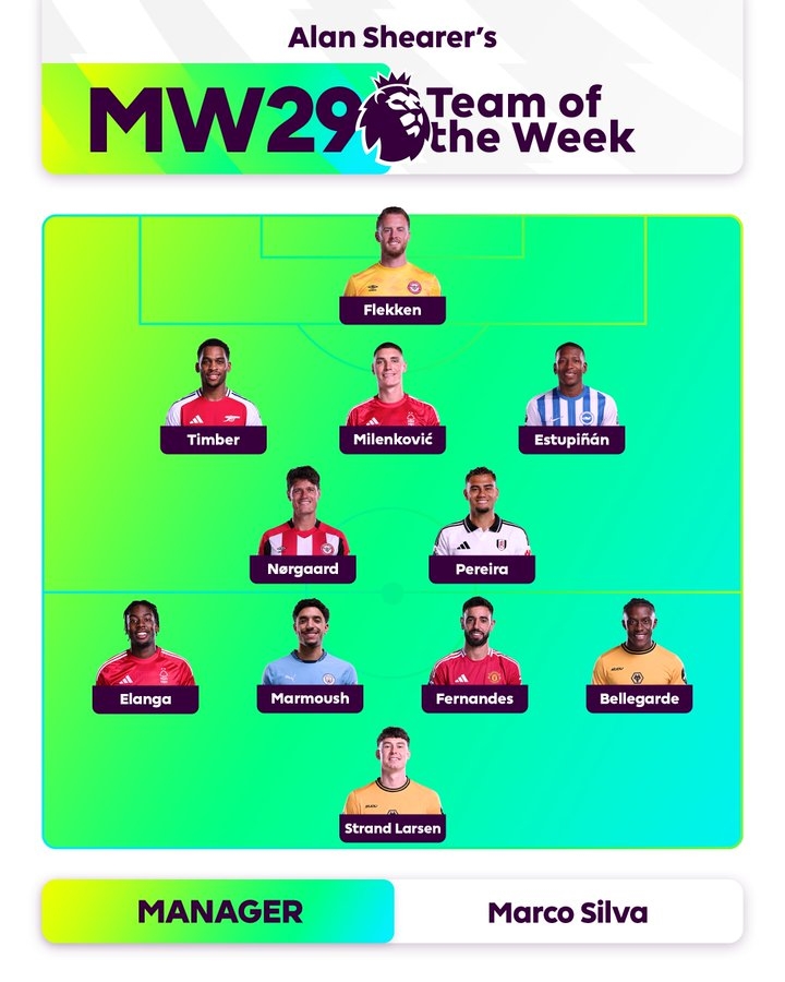 中場:諾爾高(布倫特福德)、佩雷拉(富勒姆)、伊蘭加(諾丁漢森林)、馬爾穆什(曼城)、B費(曼聯)、貝萊加德(狼隊)