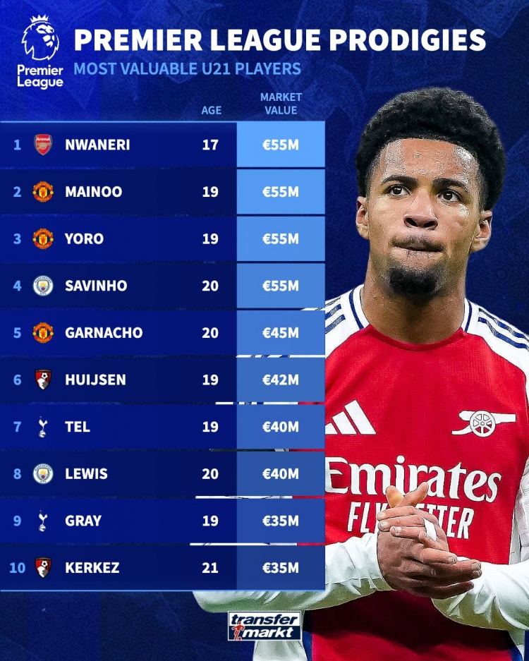 2025-03-19 22:21:25英超U21德轉身價:恩瓦內里、梅努、約羅、薩維尼奧5500萬歐最高