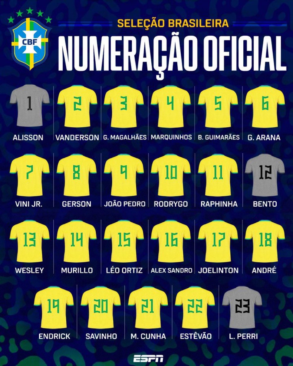 2025-03-20 17:50:38巴西最新號碼:若昂-佩德羅9號、維尼修斯7號、羅德里戈10號