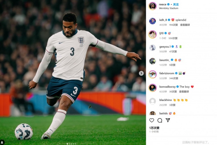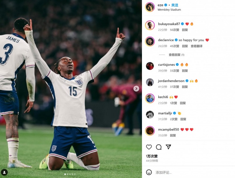 2025-03-25 18:36:54同場打進英格蘭隊處子球!里斯-詹姆斯&埃澤社媒曬照紀念