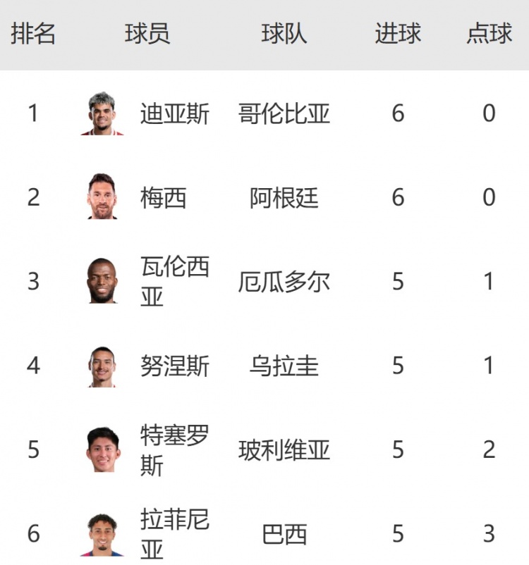 2025-03-26 11:16:49南美區(qū)世預(yù)賽射手榜:迪亞斯6球平梅西并列榜首,努涅斯&拉菲5球