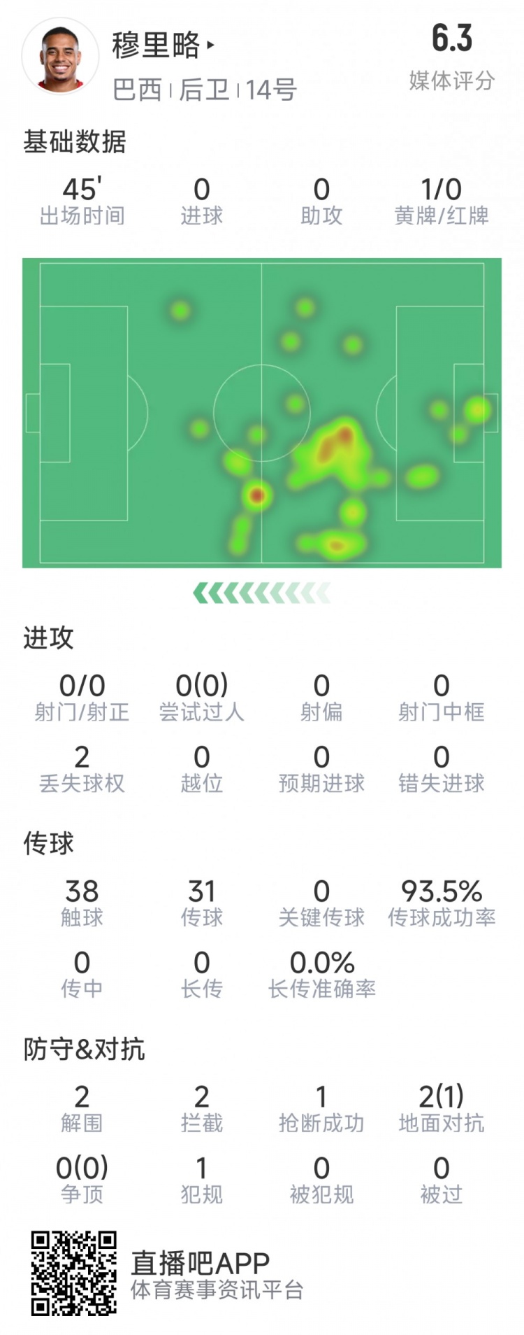 2025-03-26 11:20:28半場被換下,穆里略本場數據:兩次烏龍助攻,2解圍&2攔截