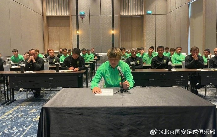 周金輝董事長的發言鼓舞了全隊的士氣,隊長張稀哲隨后代表全體隊員發言,他說:“新教練組的到來重塑了我們的足球思維,起初或許有磨合的陣痛,但現在,我們清晰感受到——這支團隊的心跳得更快、更齊了。我們也將在主教練的帶領下,同心協力,一切以團隊為先,集體為先。遵守隊規,遵守賽風賽紀,堅守職業道德。身披綠色戰袍的這些年,工體山呼海嘯的吶喊早已刻進骨髓。我們記得球迷在場內堅毅又期待的目光,記得數以萬計的的綠色圍巾,更記得一次次場內tifo給予我們的力量。新賽季的倒計時已經響起!我們會像捍衛家門一樣守護每一寸球場。沒有保留,沒有退路,唯有將每一分鐘燃燒到極致——為了北京,為球迷,更為了我們的信仰,“國安永遠爭第一”!”