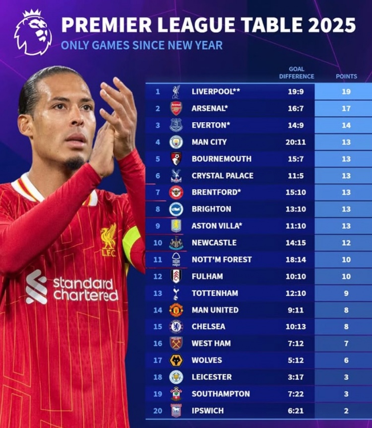 2025-02-26 05:01:202025英超積分榜:利物浦19分、阿森納17分,曼聯切爾西各8分
