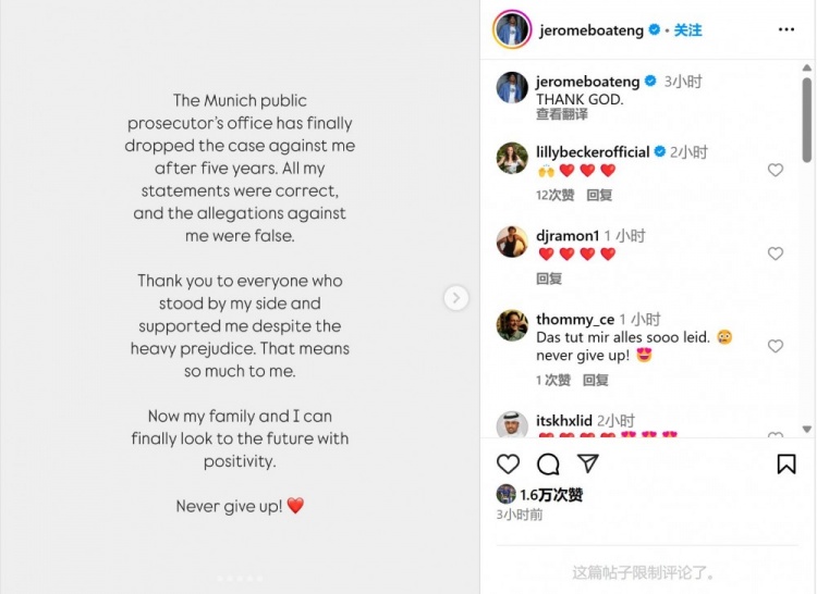 2025-03-27 11:09:59博阿滕更新社媒,慶賀針對他的家暴指控被撤銷
