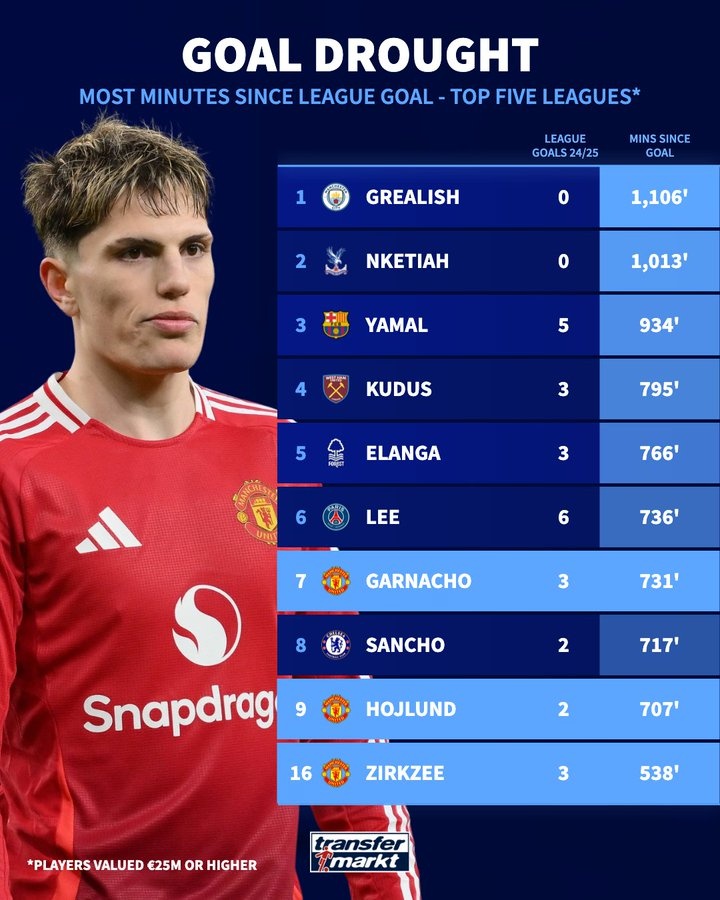 2025-02-26 05:01:24五大聯賽進球荒時間排名:格拉利什1106分鐘居首 亞馬爾934分鐘