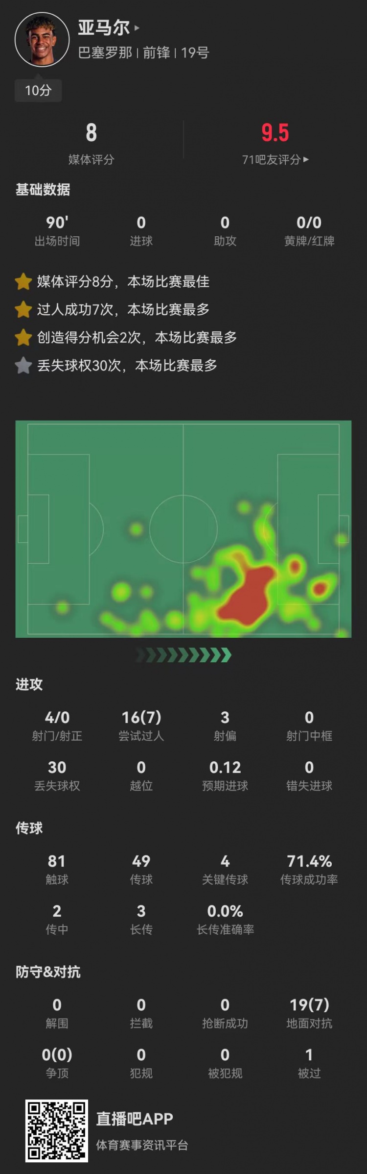 2025-03-28 13:20:40亞馬爾本場4射0正+4關(guān)鍵傳球 7成功過人+2造良機+30次丟失球權(quán)