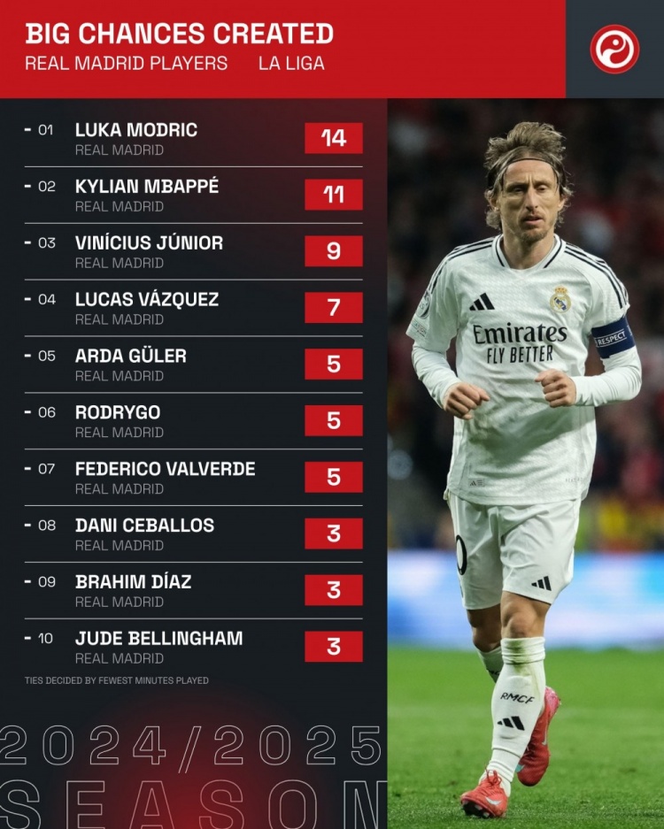 賽季至今,莫德里奇的出戰(zhàn)時(shí)間為1255分鐘,其中創(chuàng)造出了46次機(jī)會(huì),14次創(chuàng)造出重大機(jī)會(huì),收獲4次助攻。