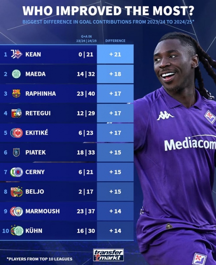 2月26日訊 《轉會市場》統計了歐洲前十聯賽球員相比上賽季的直接參與進球提升情況,小基恩居首。