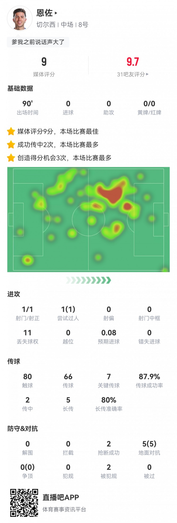 2025-02-26 10:02:16戰(zhàn)神!恩佐數(shù)據(jù):7次關(guān)鍵傳球,5次對抗全成功,評分9.0全場最高