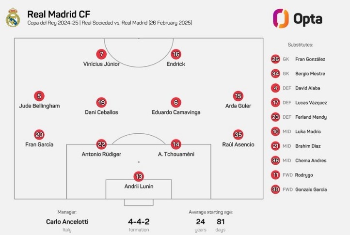 2025-02-27 05:00:10皇馬變陣,居勒爾、恩德里克、維尼修斯首次搭檔先發出戰