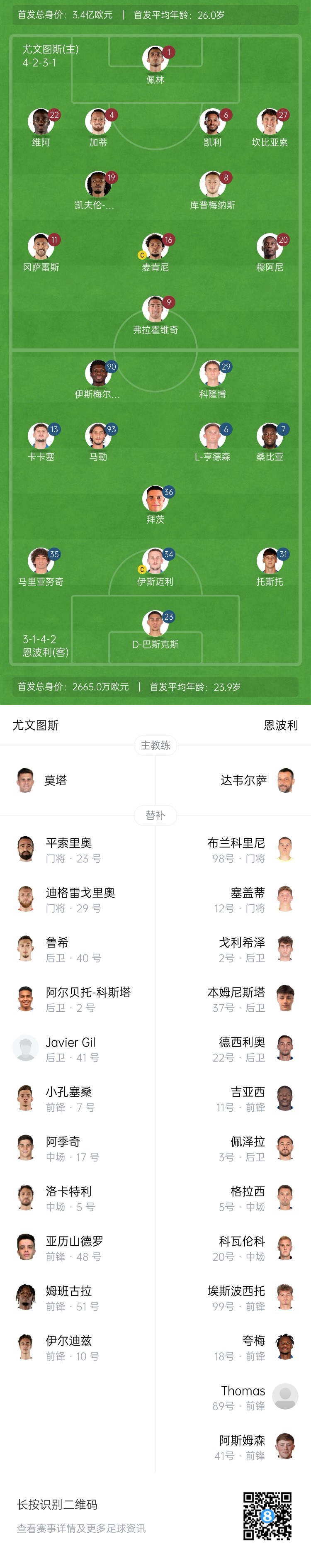 尤文首發(fā):1-佩林、22-蒂莫西-維阿、4-加蒂、6-凱利、27-坎比亞索、19-K-圖拉姆、8-庫普梅納斯、20-穆阿尼、16-麥肯尼、11-尼古拉斯-岡薩雷斯、9-弗拉霍維奇