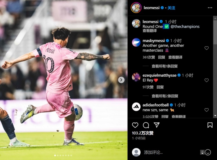 梅西本場打進一記凌空抽射,賽后他在社媒曬出比賽照片,并配文:第一輪?。