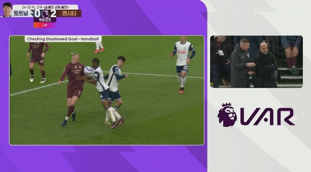 2月27日訊 英超第27輪,熱刺vs曼城。比賽補時階段,哈蘭德破門!隨后VAR介入,哈蘭德、丹索均有手球嫌疑,最終進球被判無效!