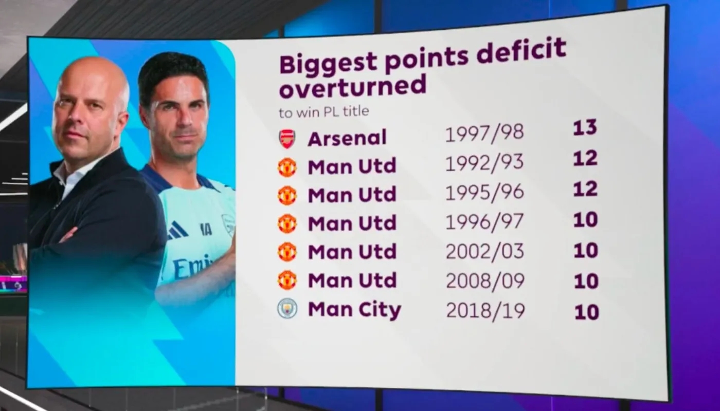 2025-02-27 15:01:18有先例!97/98賽季阿森納落后13分翻盤奪冠,但...