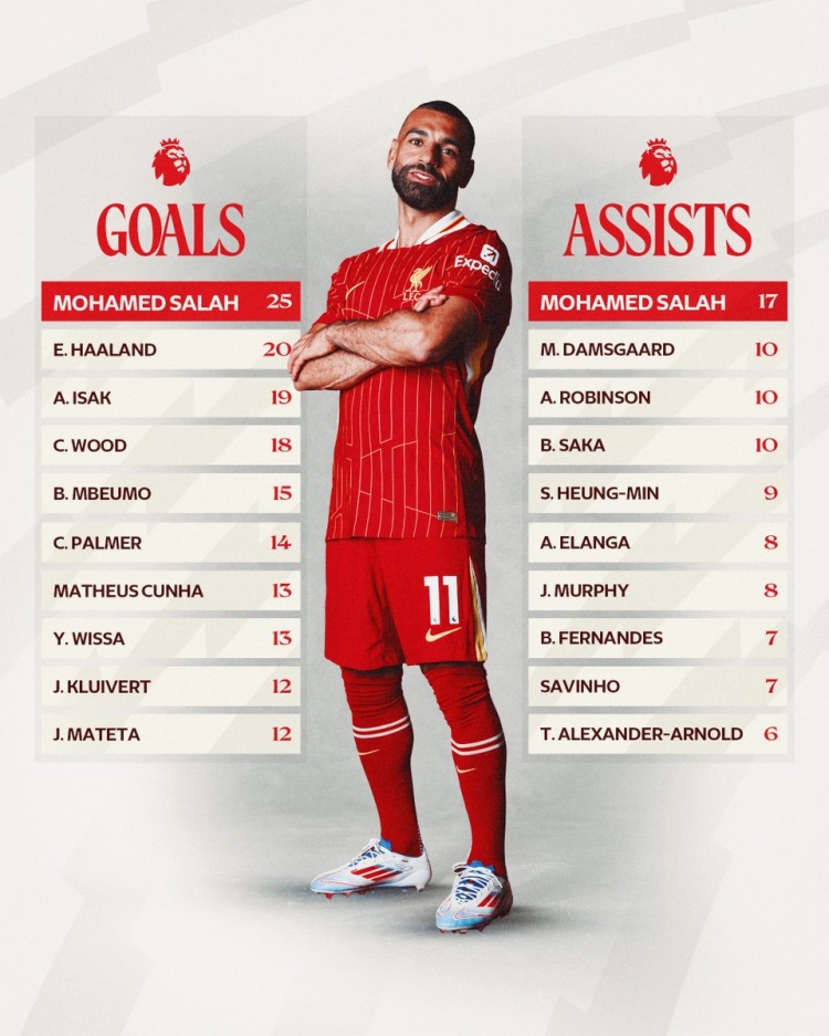 2025-02-27 20:07:17助攻+1,利物浦曬薩拉赫本賽季聯(lián)賽數(shù)據(jù),進(jìn)球助攻數(shù)均領(lǐng)跑