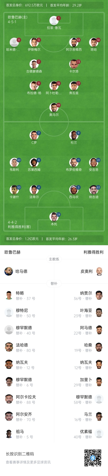 利雅得勝利首發:24-本托、3-西馬坎、4-法蒂爾、83-納吉迪、50-卡謝什、11-布羅佐維奇、8-蘇萊西姆、80-韋斯利、20-安杰洛、9-杜蘭、7-C羅