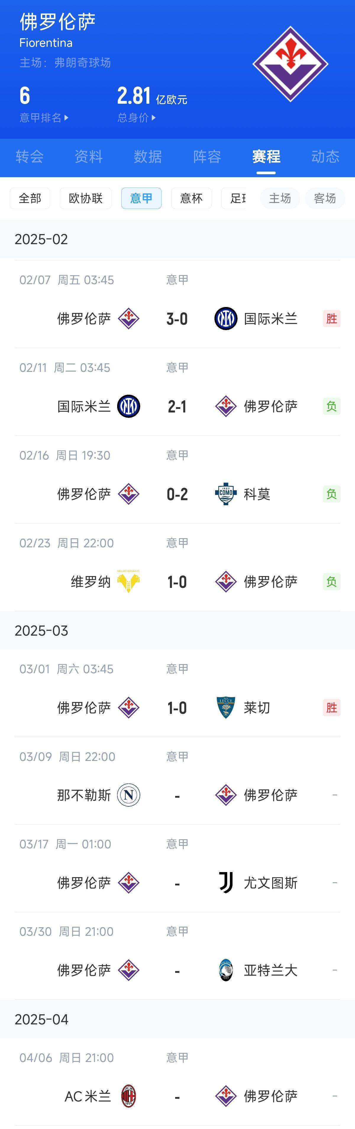 2025-03-01 15:01:42冠軍判官?佛羅倫薩未來3輪分別打意甲2/3/4,此前曾3-0第1名國米