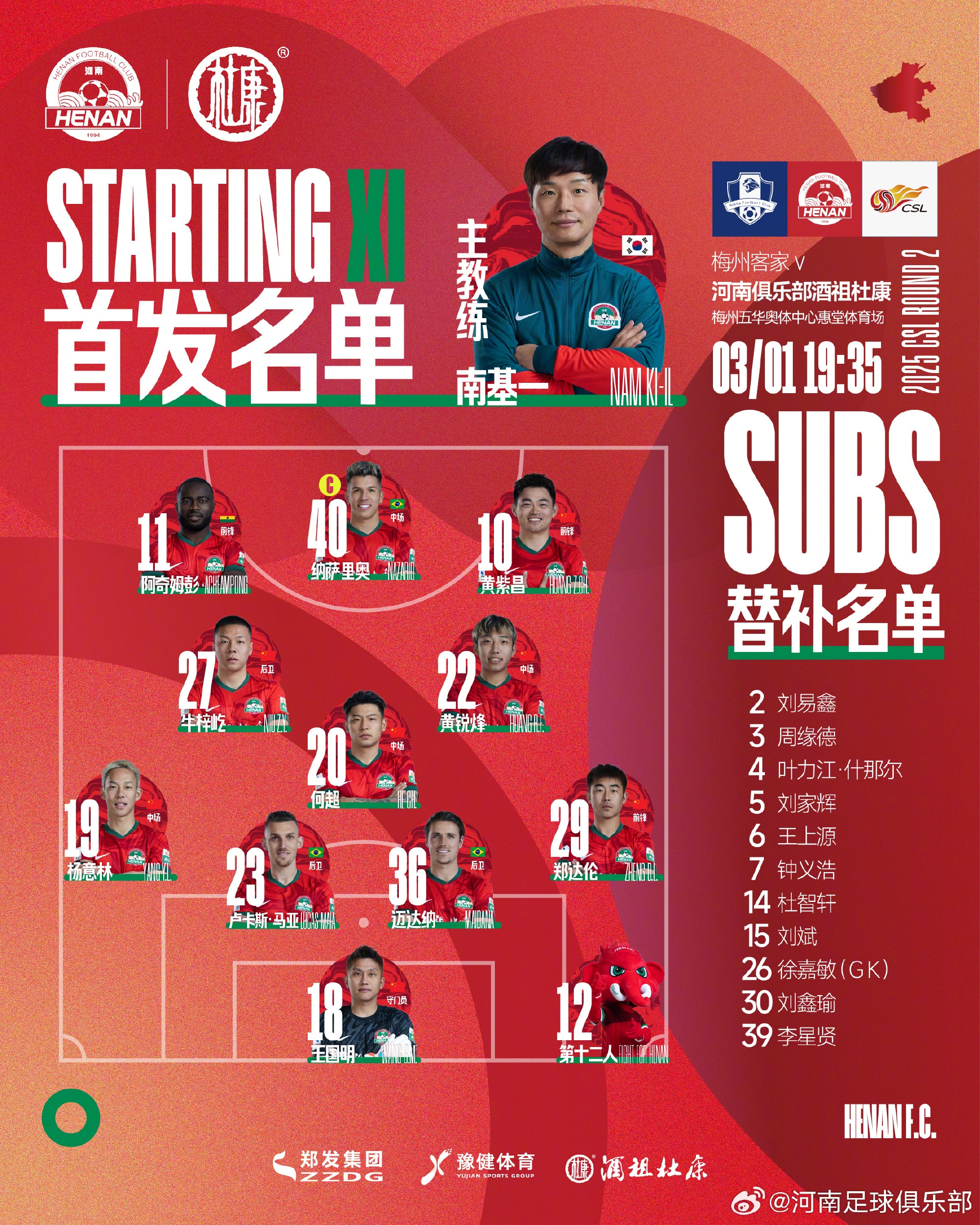 03月01日訊 今晚19點35,中超第2輪河南客戰梅州客家,賽前河南公布首發名單,外援前鋒卡多索因傷缺席。
