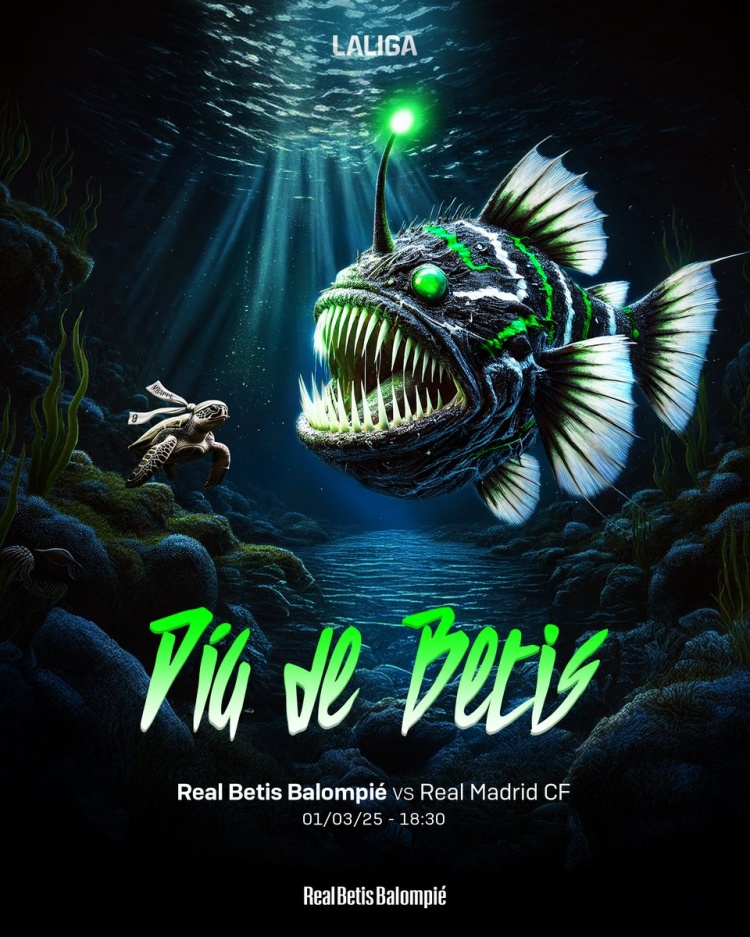 2025-03-01 20:25:27貝蒂斯戰皇馬海報:燈籠魚pk印有姆巴佩名字以及9號的海龜