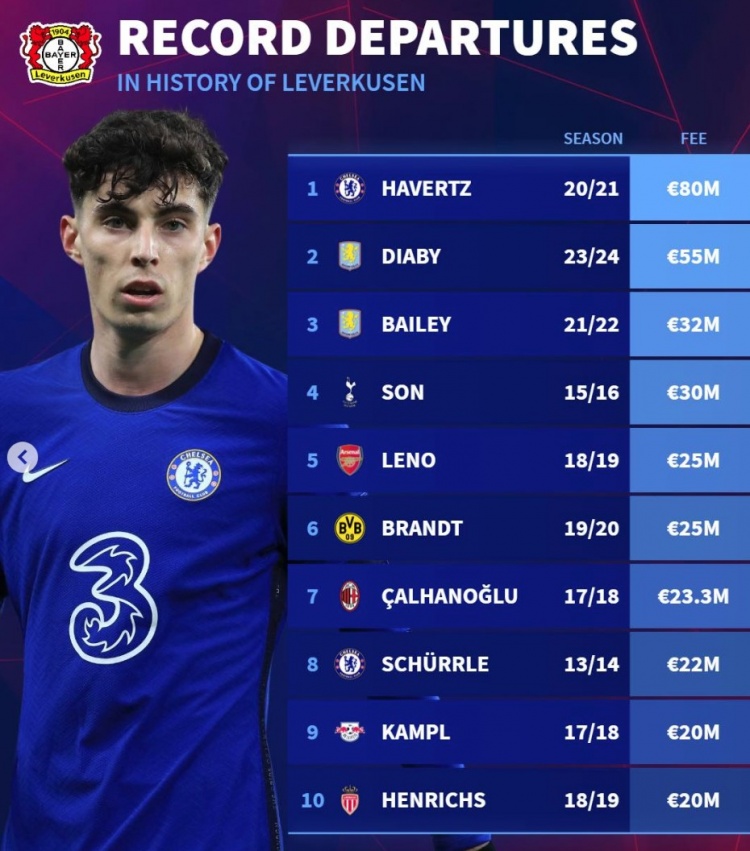 3月2日訊 《轉會市場》統計了勒沃庫森隊史賣人最貴榜,哈弗茨以8000萬歐元居首。