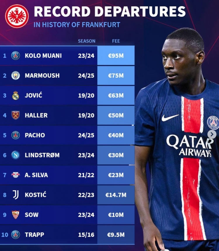 2025-03-02 01:12:16法蘭克福隊(duì)史賣人榜:穆阿尼&馬爾穆什領(lǐng)銜,約維奇&阿萊在列